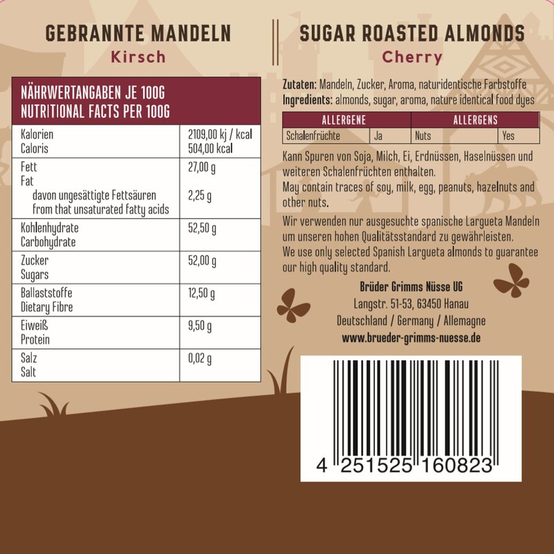 Brüder Grimms Nüsse - Sugar Roasted Almonds - Cherry - Who does not remember his childhood and the obligatory visit to the Christmas market or Chriskindelsmarkt as it is called in Bavaria. The delicious scent of freshly roasted almonds makes your mouth water. It is precisely this taste and quality that we developed for our Brothers Grimms Nuts Branded Fairground Almonds. After a long tradition and experience in almond and nut distilling, we offer this classic in the roasted almonds online shop in the premium quality that is loved and valued worldwide.